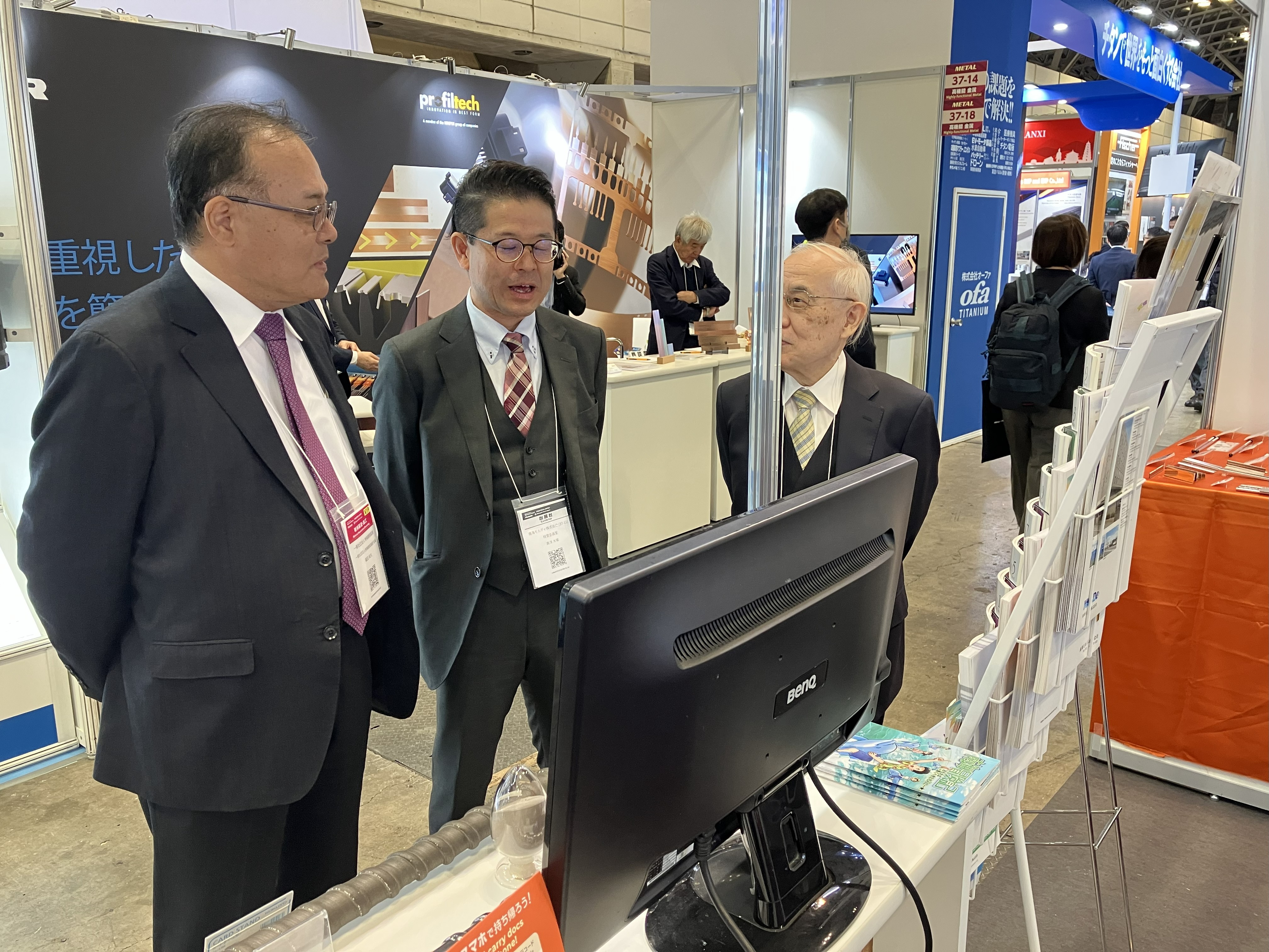 また、展示会初日(11月12日)には、福田会長が来場し、共同出展各社からの高機能製品 の説明に熱心に聞き入っていました。